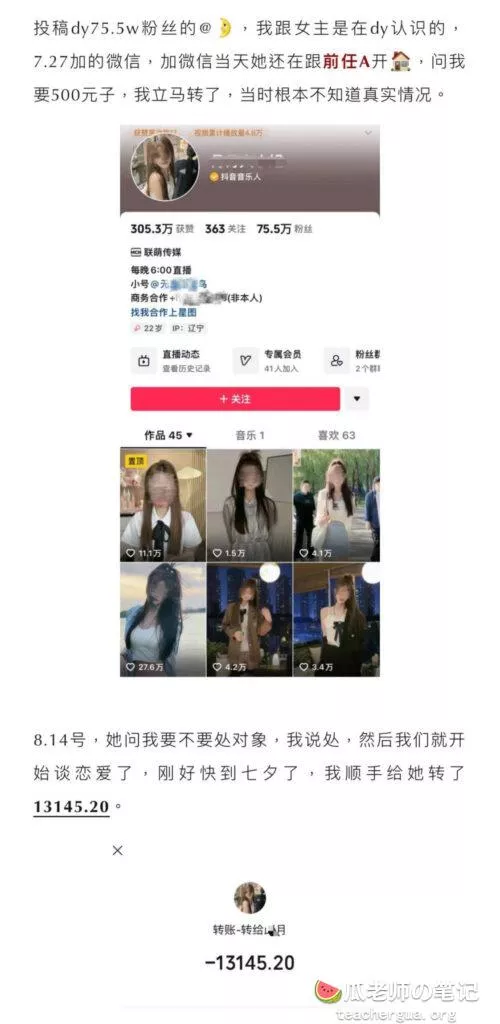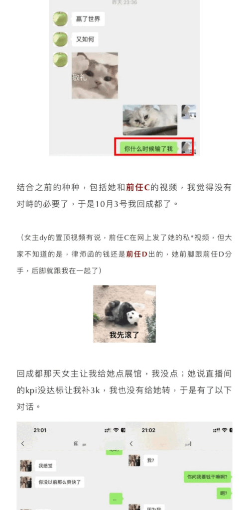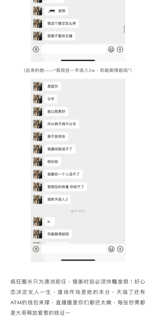 76万粉丝的经典捞女月月大小姐估计瓜友有不少都关注了吧,直播间也看的不少,本以为是一位清纯且励志的女主播,没想到今日一看,匪夷所思,外表光鲜的背地里其实烂病缠身,与苦主谈恋爱时还多次出轨前任,还是多位前任,甚至还问苦主要钱开房,真的看的瓜姐都吓呆了,这么不要脸的女生真的有一次看见。