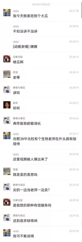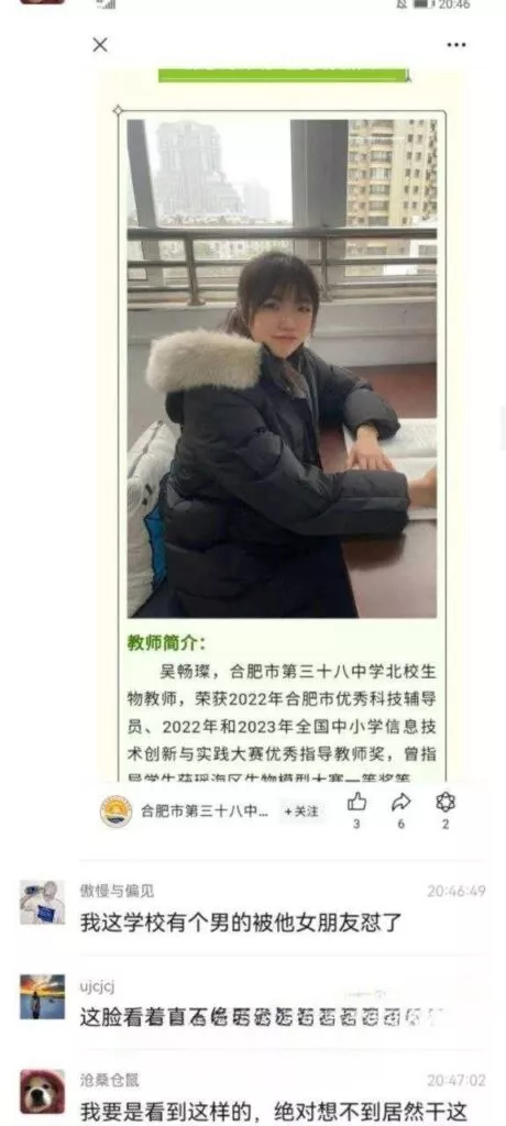 合肥38中北校生物老师吴畅璨被指白天学校上课晚上陪睡缘交女