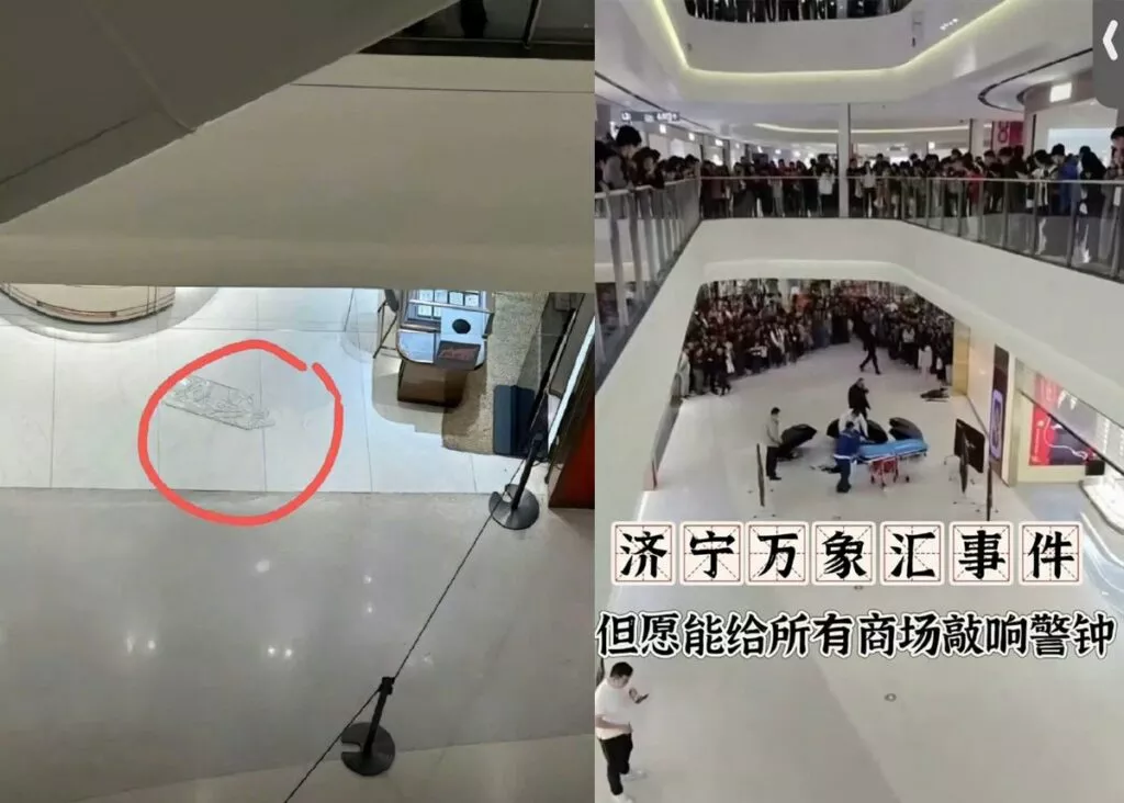 济宁万象汇商场四楼白衣女孩倚靠自动扶梯不慎坠楼事件