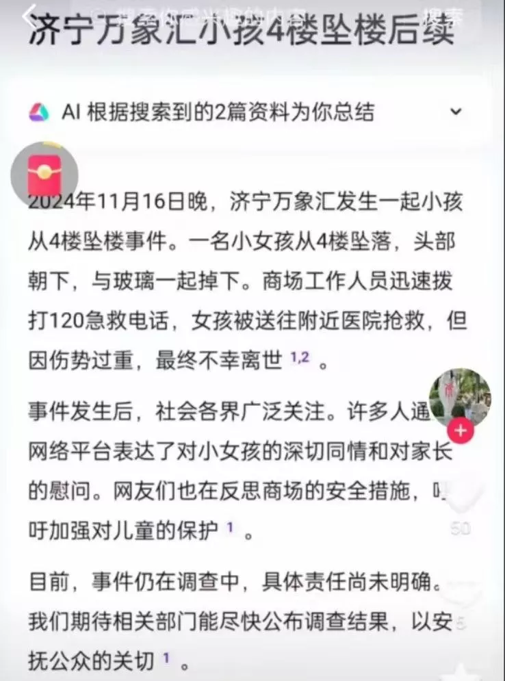 2023年11月16日,济宁万象汇商场发生了一起悲剧。一名身穿白衣的女孩站在四楼的自动电梯旁,随后她半坐在扶手上。此时,恰好有一名顾客从电梯下行,导致女孩被自动扶梯意外带下,最终不幸从四楼坠落,造成了严重后果。
