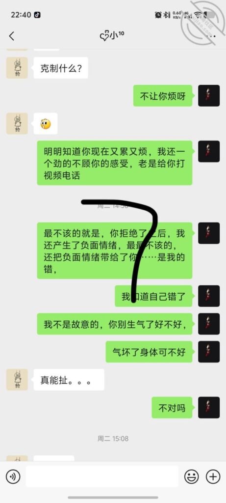 怎么跟兄弟们说呢,事情是这样的,现在不是暑假了嘛,燕妹把她两个小孩接到她那里过暑假了,前段时间我实在太想她了,就经常给她发视频,信息什么的,开始还好好的,可是我感觉她在故意疏远我,越是这样我心里越急,然后我发的就越频繁……!