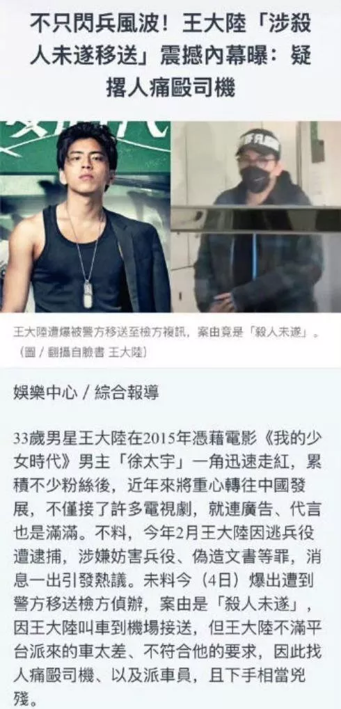 台湾男演员王大陆因涉嫌“杀人未遂”被警方移送检方进行调查。据了解,此事件的起因是王大陆在某平台叫车后对车辆质量表示不满,随即指使一名姓游的朋友对司机施加暴力。其手段极为残忍,甚至可以说是企图致人于死,这一行为显然已经严重超出了普通打斗的范畴。