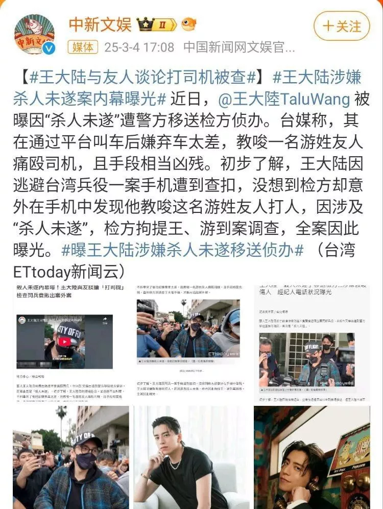 台湾男演员王大陆被曝已被警方逮捕送检疑因教唆他人殴打网约车司机